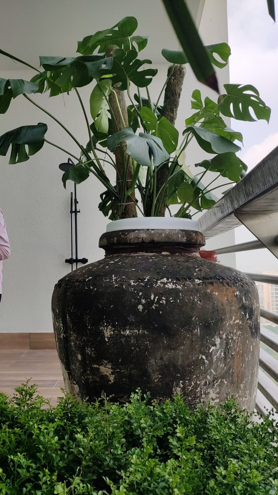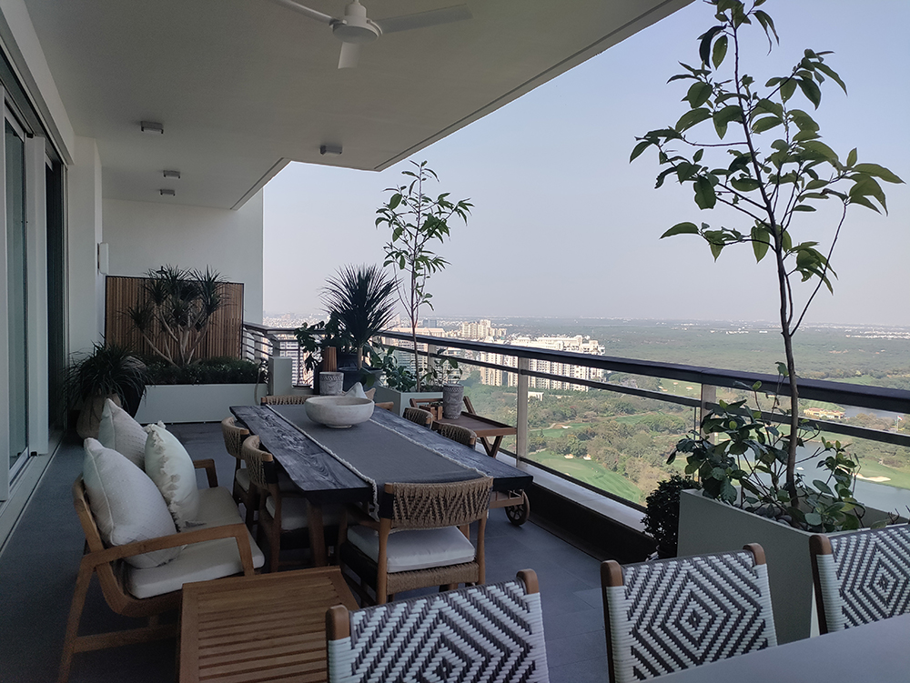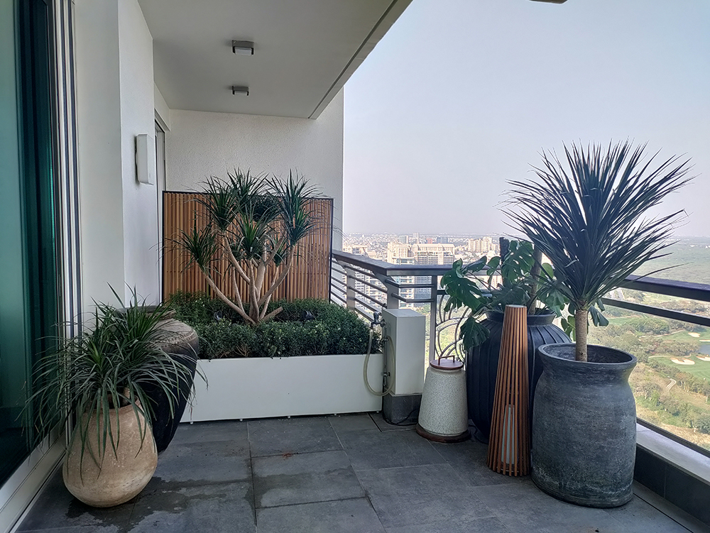 This was one huge corner apartment on the 31st floor in DLF Camellias. Being situated in the corner building this apartments had many advantages, it had vast openness on one side and lush greenery of golf course on the other side. The total floor area of apartment was around 7000 sq. feet and there were 5 huge balconies overlooking water body & beautiful golf course. Each room had a huge balcony which served as open green area for sitting and dining outdoors. We used huge planters of size 7’ by 6’ at one place with a screen to divide a huge balcony. A beautiful multi-stem dracaena with a 6’ spread used in that planter as shown in picture. The Villa had beautiful tropical Balinese interiors and to complement that we used huge antique urns and pots specially ordered from Thailand. For living room balcony, a lovely dining table with a bar in the corner was planned.