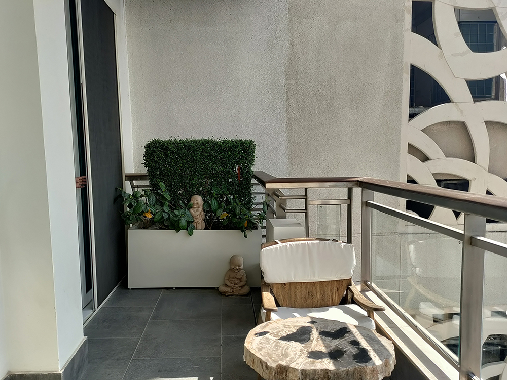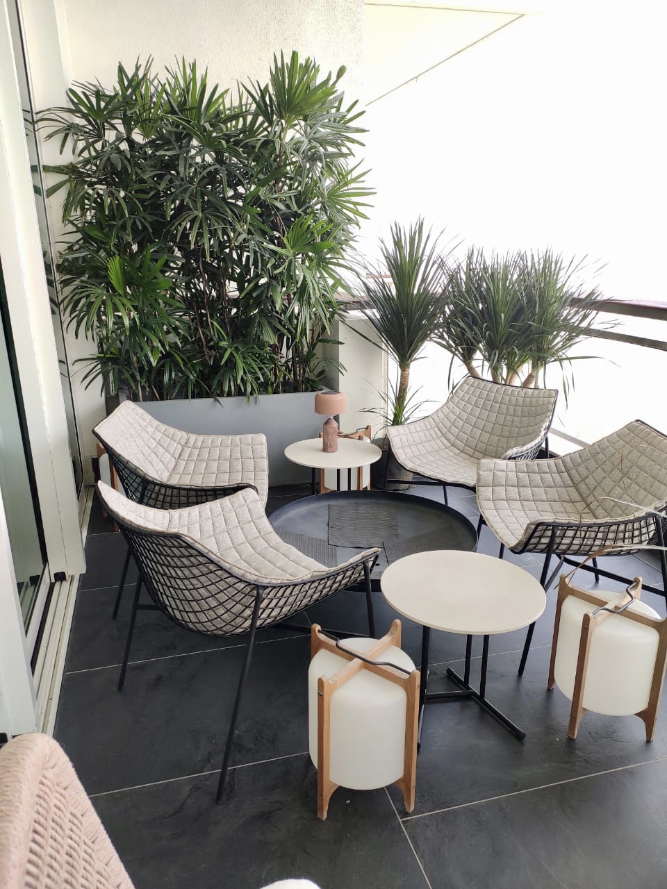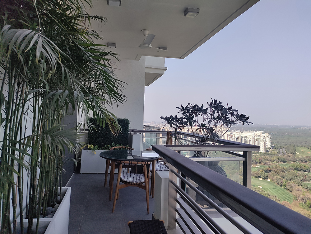 The other balcony space adjoining bedroom and office had a coffee table and tall ready hedge plantation to hide the walls. We also