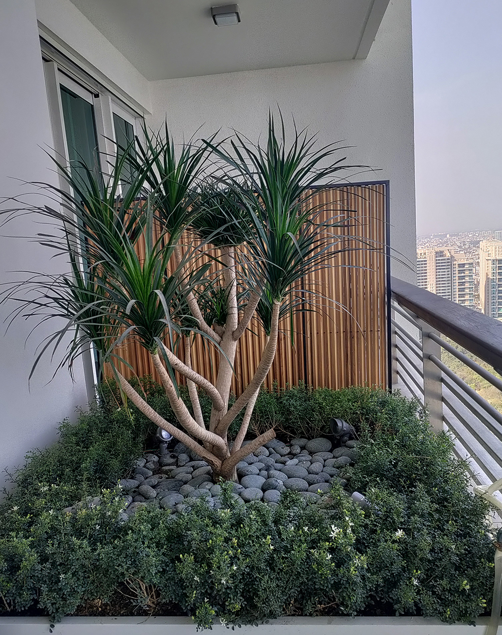 For other side Bedroom balconies, the plants were selected as per high sun exposure like multicoloured bougainvillaea tree and Nicodia/Purple sage.